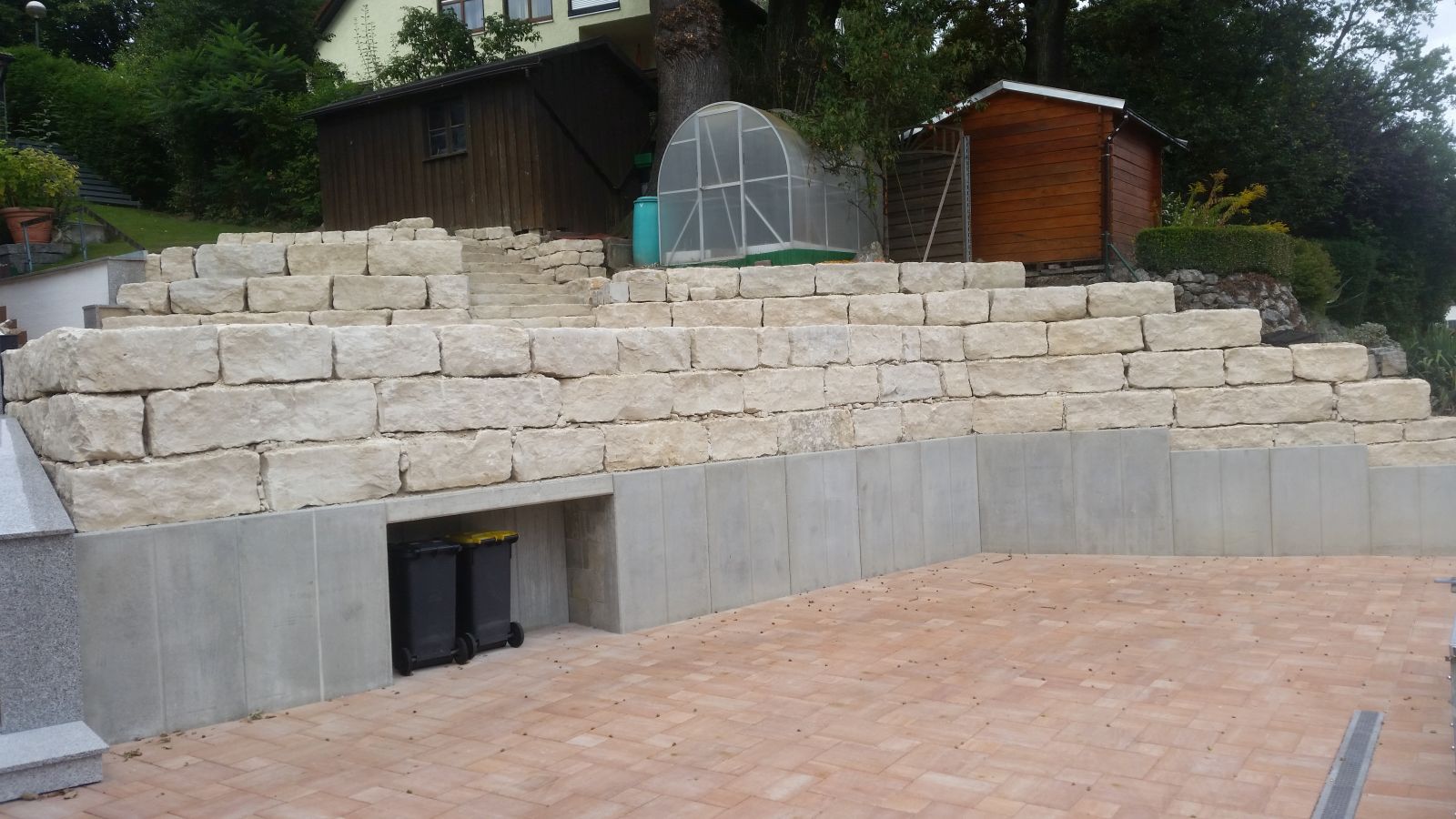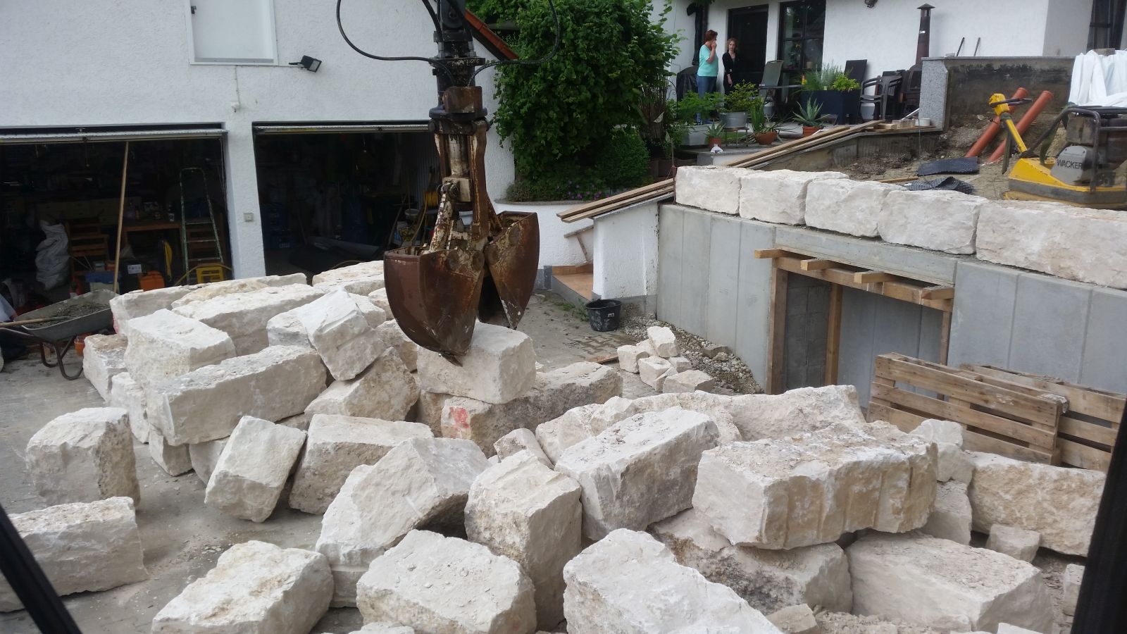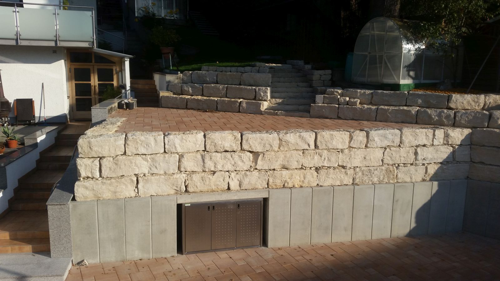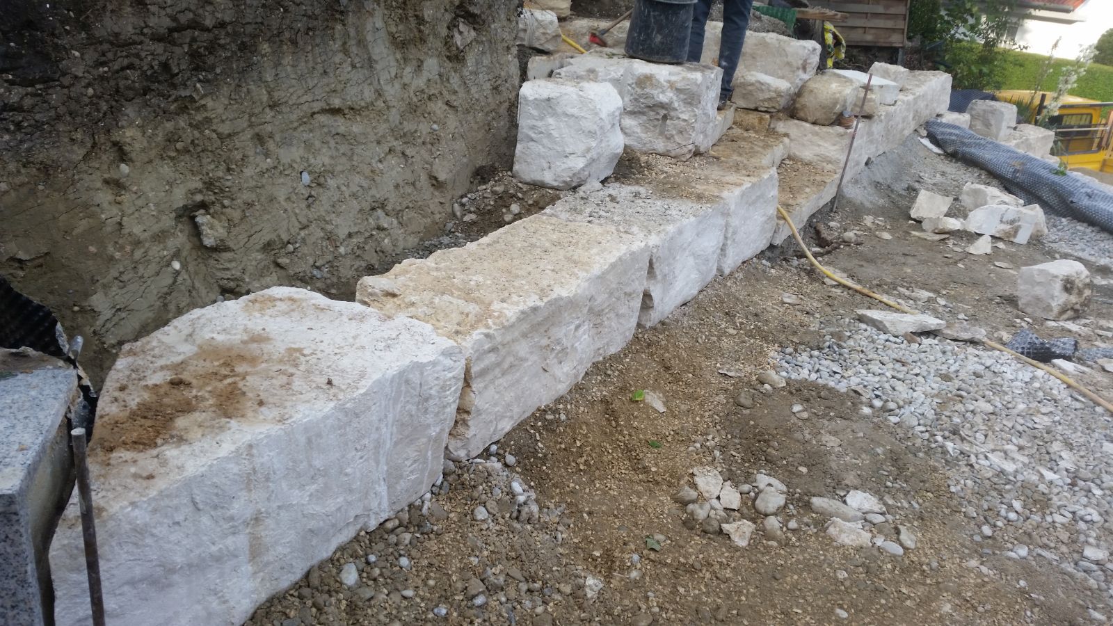 Oberhalb der L-Stein Wand wurde der Hang weiter mit einer Trockenmauer aus Jura-Kalksteinblöcken gesichert.